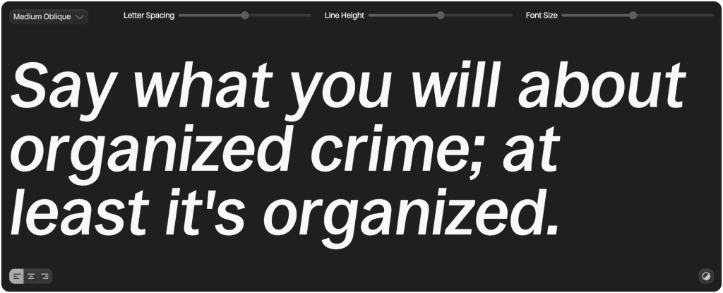 Ronzino ships with Regular, Medium, and Bold weights, each with matching Oblique (italic) styles, supporting a wide range of typographic hierarchies and use cases. It was designed specifically for the needs of a modern web and communication environment, ensuring clarity and legibility at various sizes and in digital contexts. While Arial has slightly softer curves and open apertures compared to Helvetica, Ronzino refines these qualities further, offering a more harmonious and readable appearance for both body and display text.