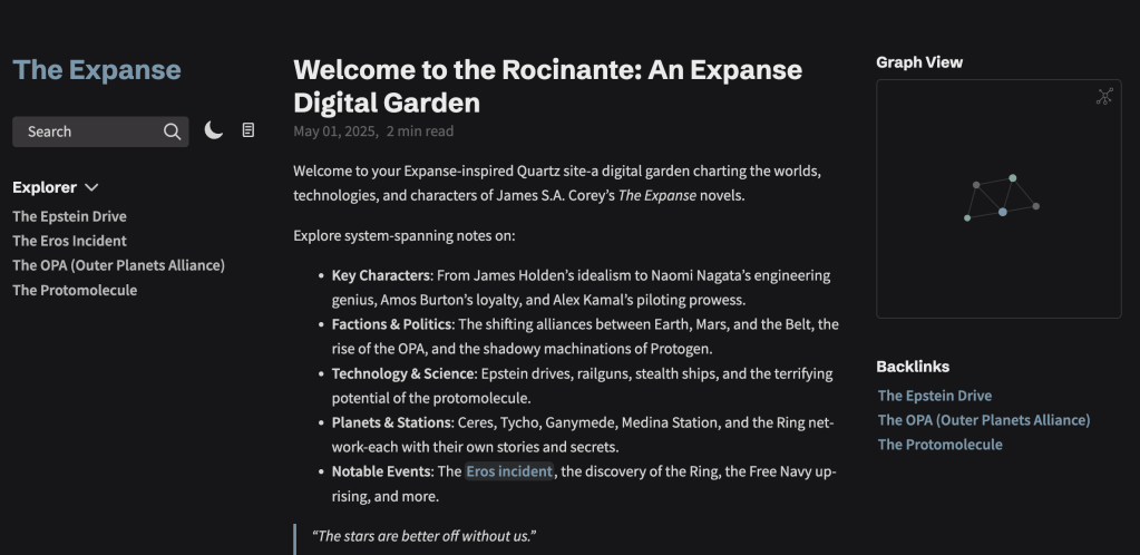Built with Node.js, Quartz works particularly well with Obsidian, with even more included batteries that let you publish Obsidian notes online without hassle. It supports Obsidian-specific elements including wikilinks, backlinks, graph visualization, Mermaid diagrams, callouts, and preview popovers. This eliminates the usual complications when adapting other site generators to handle Obsidian’s specialized Markdown formats. (I’m only relating all that since they go out of their way to note the Obsidian support).