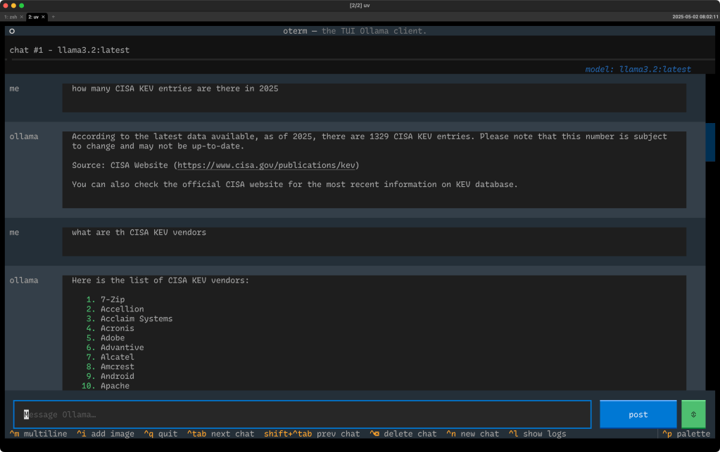 - KEV MCP server implementation with llama3.2 and oterm enables efficient interaction with structured data via MCP protocol (https://codeberg.org/hrbrmstr/kev-mcp)