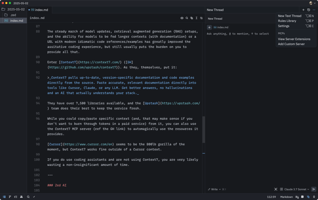 If you haven’t looked at Zed, recently — especially their AI integration improvements — I assert you might want to take some time this weekend to do so (use the Preview channel when you do, too).