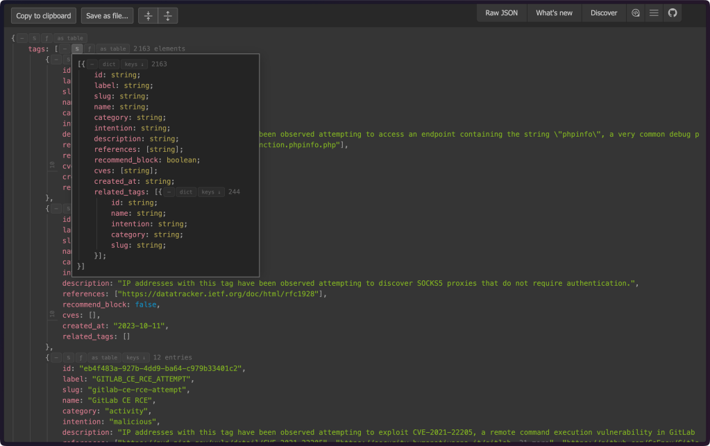 At $WORK We deal with many “foreign” APIs and collaborate with enough external research teams that we often encounter odd (I might even say “chaotic”) JSON blobs that are difficult to grok (I’m looking at you, HAR files). Discovery.js (GH) is another tree in the Jora ecosystem that is built around making such data discoverable.