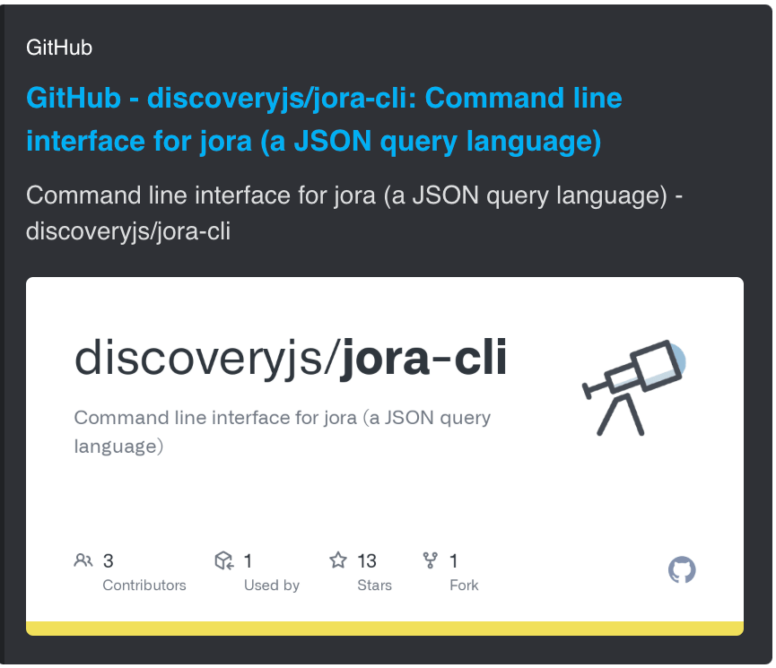jqor are at least familiar with JSON Path, I won’t be covering Jora’s query syntax extensively, but do encourage folks to peruse that URL to grok some interspersed examples in today’s tome.