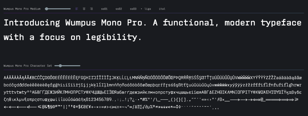 - Wumpus Mono is a modern monospaced freemium font designed for programming, with features like OpenType stylistic sets and programming ligatures, available for free via GitHub with a paid “pro” version (https://vaughantype.com/wumpus-mono-pro/)