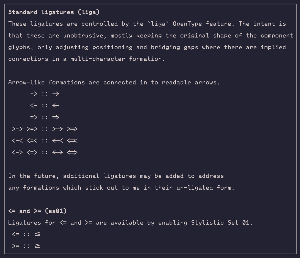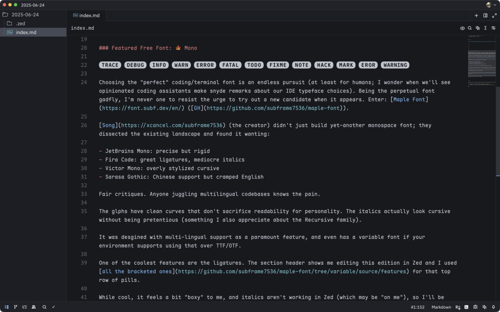 One of the coolest features is the ligatures. The section header shows me editing this edition in Zed and I used all the bracketed ones for that top row of pills.