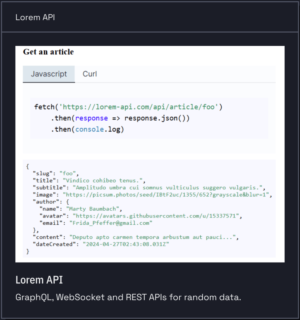 - Lorem API (https://lorem-api.com/) provides object and text generation APIs, supports multiple output formats, seeded generation, and customizable parameters, with an example site at https://rud.is/ex/lorem/.