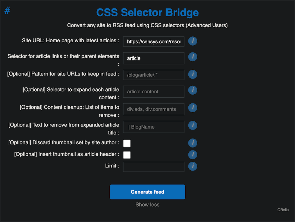 Their bridge inventory does not have a script for the new Censys blog (one of the programmatic ones I’ve relied on Inoreader for), but with the CSS Selector bridge, I was able to create one using basic web scraping. All I had to do was find the right CSS selector: