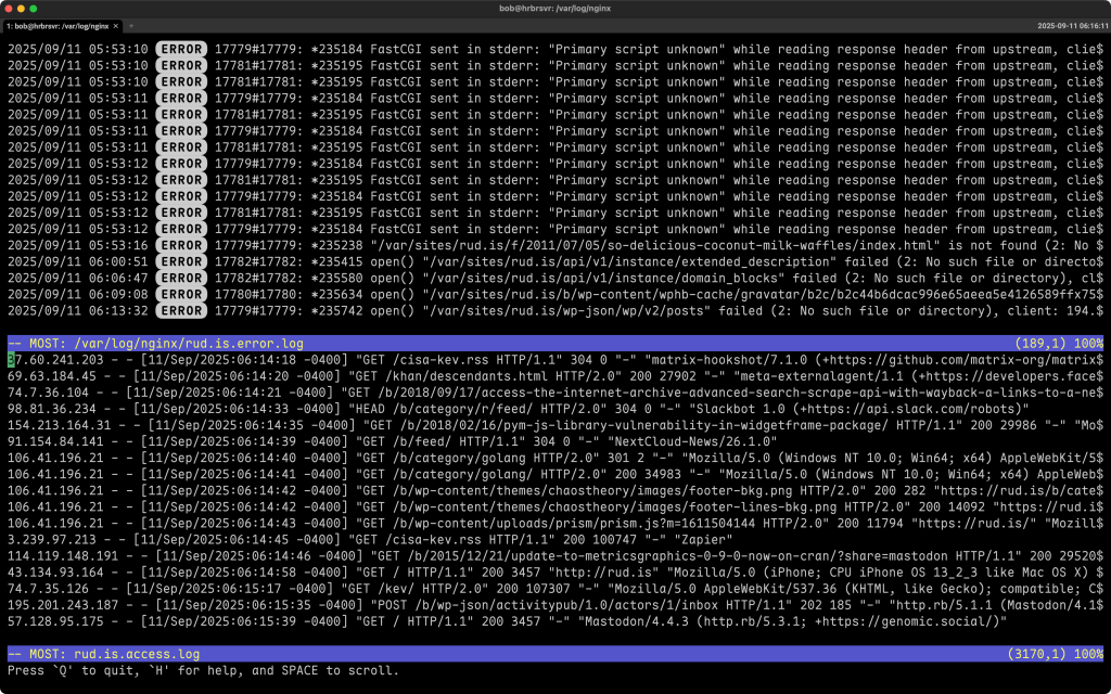 Say you’re troubleshooting nginx and want to watch your error log and access log at the same time. Instead of juggling multiple panes or editors, you can just use most and split the screen (hit H in most to see all the common key sequences) like you see in the section header. In that image, we’ve got two stacked windows: errors on top, requests on the bottom. You can scroll them independently, or lock them together and watch how that 502 maps to the actual request. It’s a simple but powerful way to debug live traffic without flipping around.