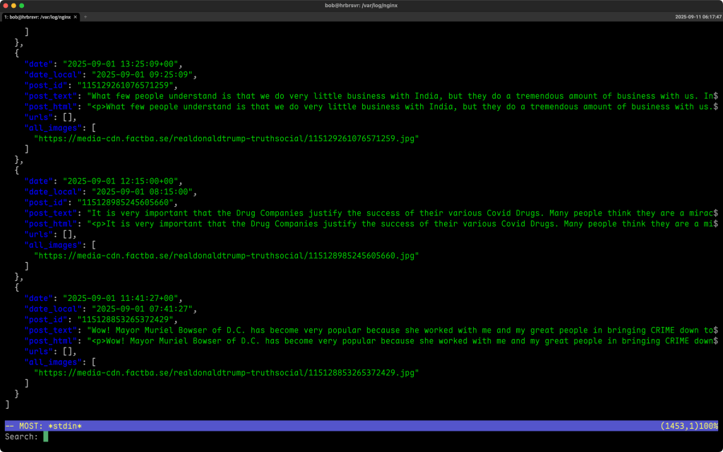 Instead of getting raw, eye-watering JSON, you get a colorized, scrollable, mouse-friendly view you can page through comfortably. Arrow keys, regex search (/), and horizontal panning make structured data far less painful to deal with.