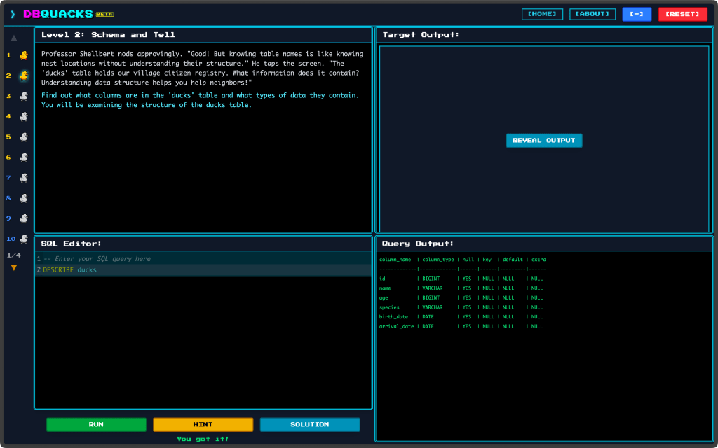 You follow Duckbert on a journey, solving challenges and mastering new concepts along the way (and, the creators are working on turning it into a full-on data-driven adventure game dubbed “The Great Duck Migration”). For now, it appears there are 38 levels in the base game.