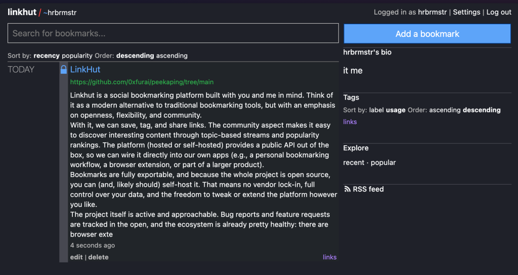 With it, we can save, tag, and share links. The community aspect makes it easy to discover interesting content through topic-based streams and popularity rankings. The platform (hosted or self-hosted) provides a public API out of the box, so we can wire it directly into our own apps (e.g., a personal bookmarking workflow, a browser extension, or part of a larger product).