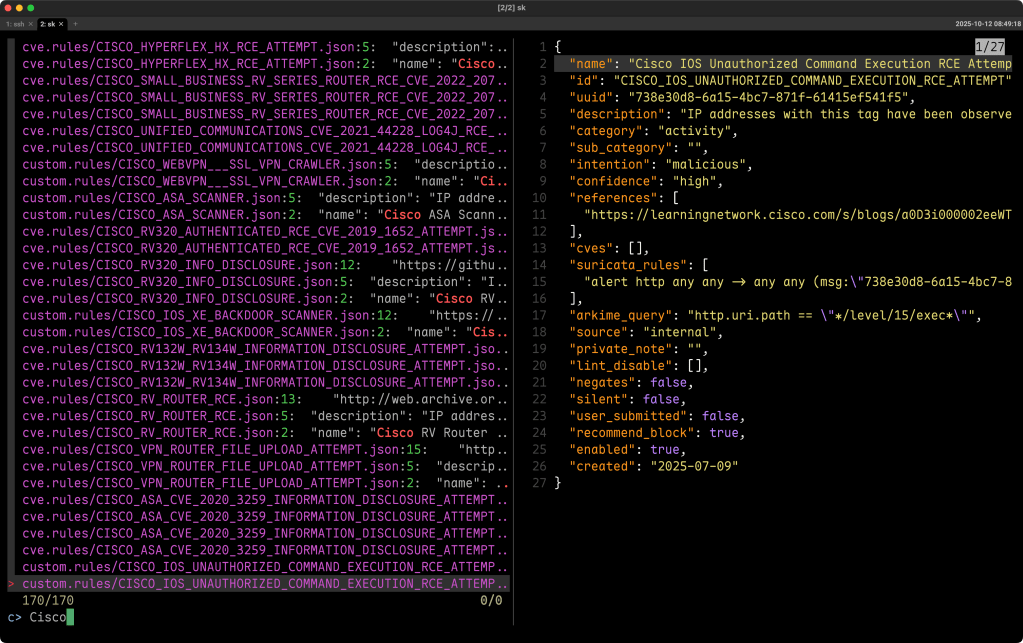 You get a split view—search on one side, context on the other—and you can control layout with flags like --preview-window up:30%. It’s an instant feedback loop that makes searching logs, code, or structured output much less painful. The section header is me looking for Cisco tags in my $WORK repo via: