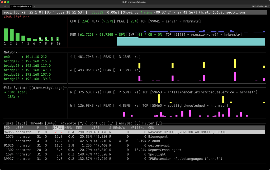 The process management feels like a modern rethinking of top. You can filter, change process priorities, send signals, and — if you’re on Linux with root privs — dig into delay accounting. It’s all real-time and reactive. Beyond that, Zenith watches for kernel errors, Docker containers, ZFS pools, and virtualization environments.