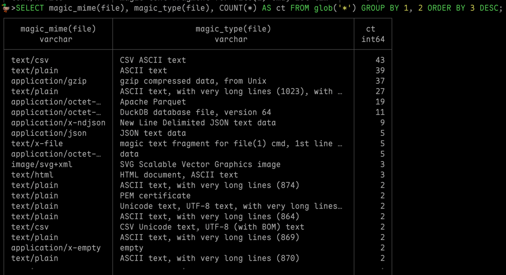 magic (GH) is a highly experimental port of libmagic (that powers file UNIX utility) to a DuckDB Community extension. Said library and CLI utility looks at the headers (and some other bits) of files to help you identify/classify them. If there is a Drop reader who has never run file FILENAME, I will be shocked.