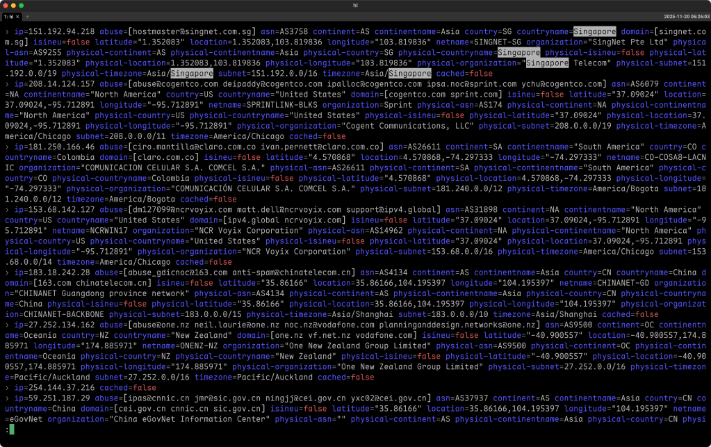 The section header is an example of me looking for Singapore IPs in some Geolocus output.