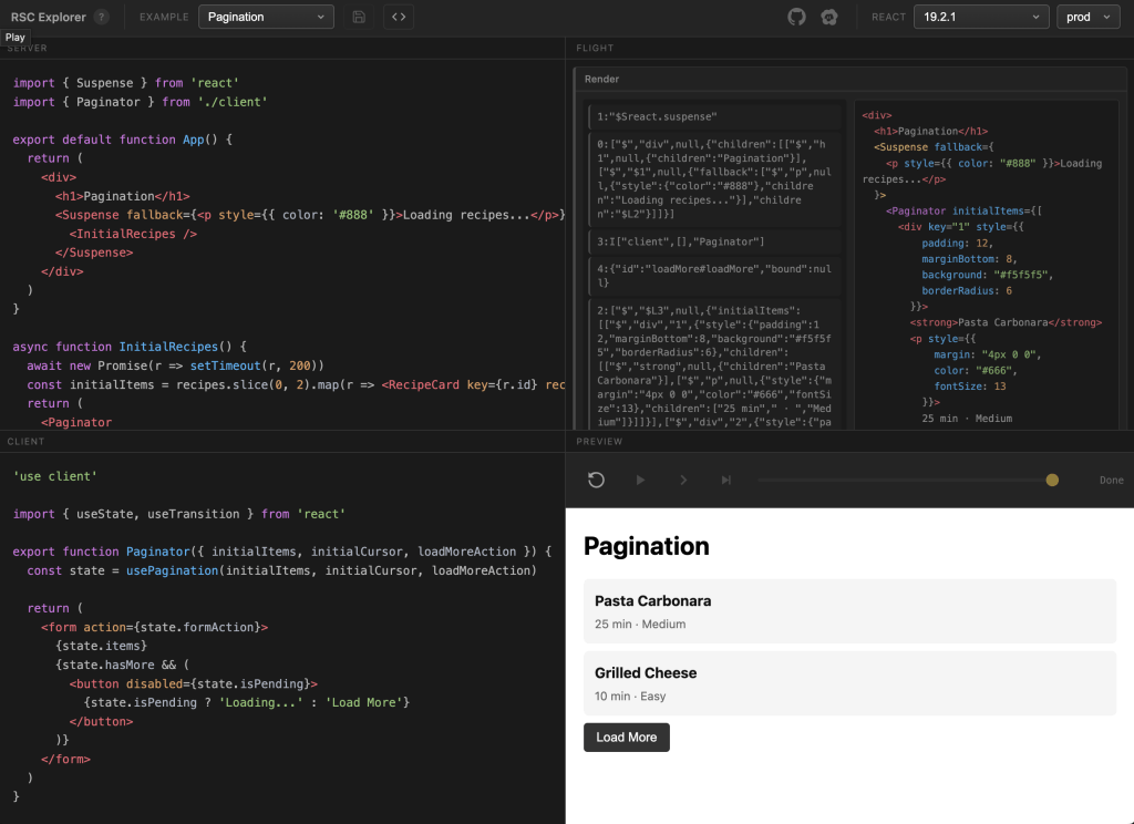 The way it works is pretty clever. You write some server and client code in the left pane, and then you can step through the execution one chunk at a time. You see the raw protocol output, the JSON-like format that React uses to serialize component trees, and then you see what the client reconstructs from that data. It makes visible what’s normally invisible.