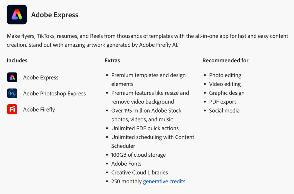 If you head here and look for “Adobe Express Premium”, you can get access to: