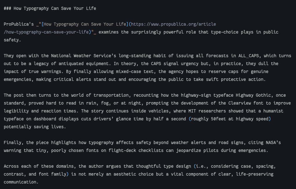 - Typography directly impacts public safety, from the National Weather Service’s ALL CAPS legacy dulling warning impacts to Clearview font improvements for highway legibility and MIT research showing humanist dashboard typefaces cut driver glance time by half a second (https://www.propublica.org/article/how-typography-can-save-your-life)
