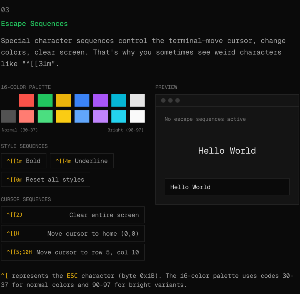 The guide covers thirteen topics, from the basic grid model through escape sequences to TUI architecture, with every concept being a working demo. The ANSI escape code section lets you click color buttons and watch the byte sequences light up (i.e., you can toggle bold, toggle underline, and the raw codes update to match). Reading about escape sequences has never done much for me, but watching them assemble in response to clicks is different.