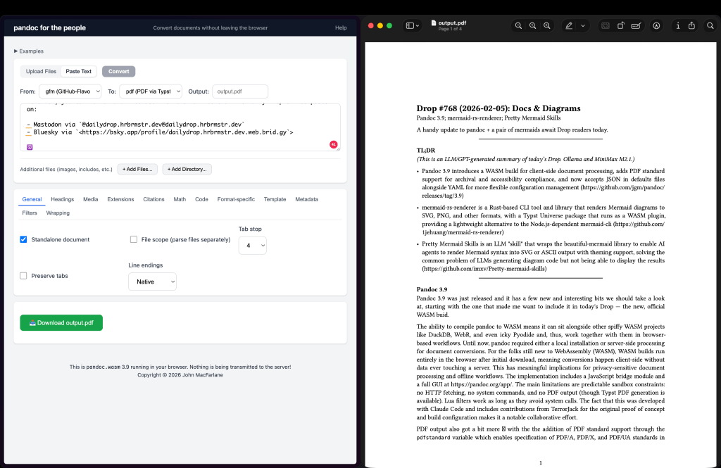 Pandoc 3.9 was just released, and it has a few new and interesting bits we should take a look at, starting with the one that made me want to include it in today’s Drop — the new, official WASM build.