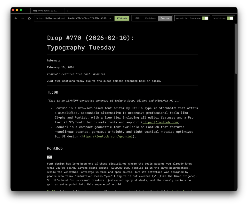 Built on Electrobun (which “TIL” and is in the next section), md-browse is a markdown-first browser that treats readable text as the default rather than the exception. When you navigate to a URL, it sends an Accept: text/markdown (also “doh! why have I not done this to various sites I run?”) header before anything else. Servers that respect that header return markdown directly, and md-browse displays it as-is. For everything else, the app fetches the HTML and runs it through a tuned Turndown (also in the last section!) conversion pipeline that strips away scripts, styles, navigation chrome, and footer clutter, pulling the actual content from semantic elements like <main> and <article> and converting it to clean markdown. The result is close to what AI tools see when they ingest a web page: just the substance, structured and readable.