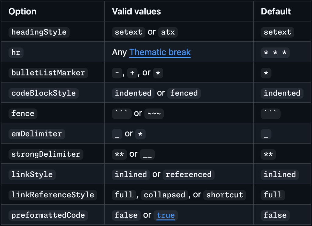Configuration handles Markdown style preferences such as heading style (setext underlines vs. atx hashes), bullet markers, code block style (fenced vs. indented), and emphasis delimiters. The turndown-plugin-gfm plugin adds what I’d call must-have GitHub-flavored extras like tables and task lists.